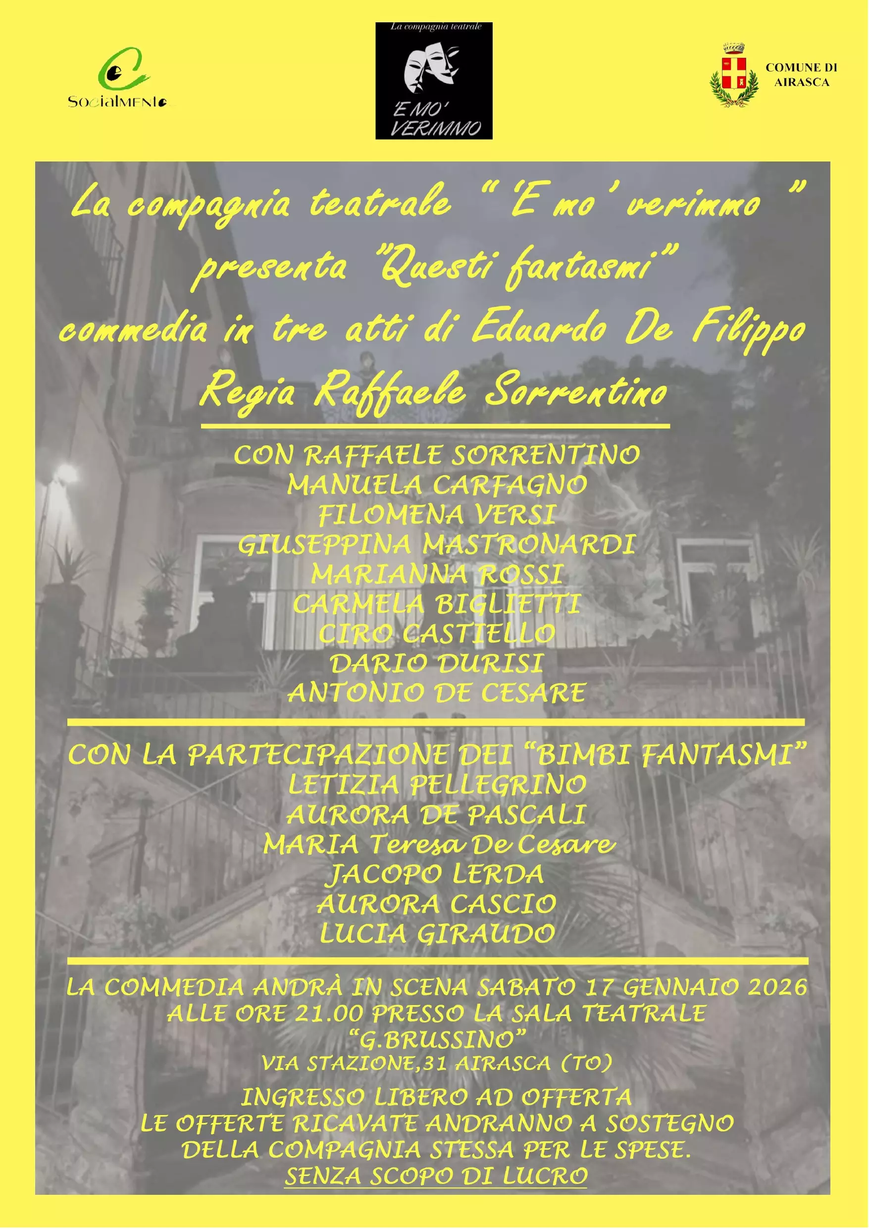 Sabato 17 gennaio alle ore 21:00 presso il Polifunzionale "Giovanna Brussino" andrà in scena lo spettacolo teatrale "Questi fantasmi", commedia in tre atti di Eduardo De Filippo, a cura del gruppo teatrale ‘E mo’ verimmo” - Associazione Socialmente APS. Regia di Raffaele Sorrentino.