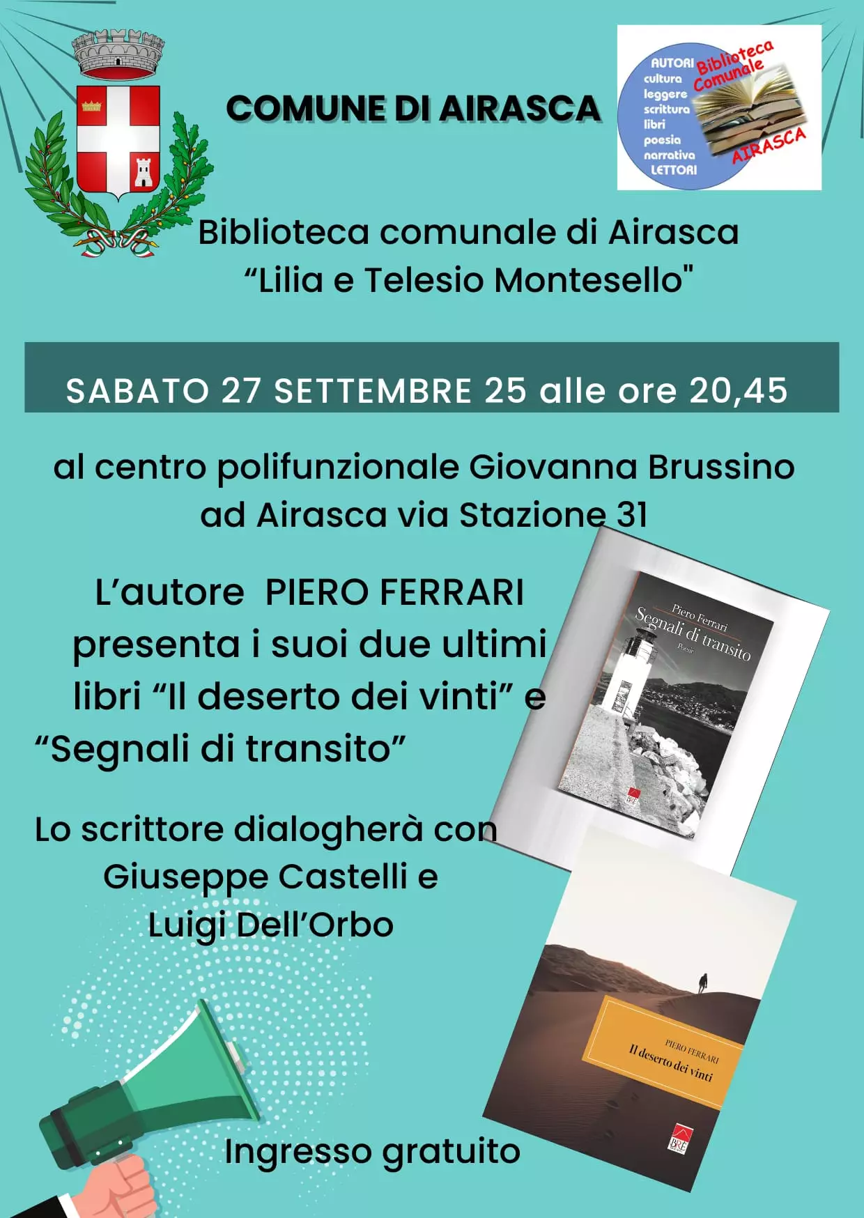 Il Consiglio di Biblioteca vi invita Sabato 27 Settembre alle ore 20:45 presso il polifunzionale di Airasca G. Brussino in Via Stazione 31, all'incontro con l'autore Piero Ferrari, che presenterà i suoi due utimi libri "Il deserto dei vinti" e "Segnali di transito".